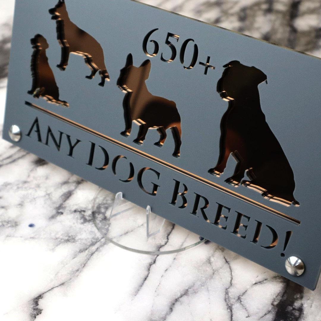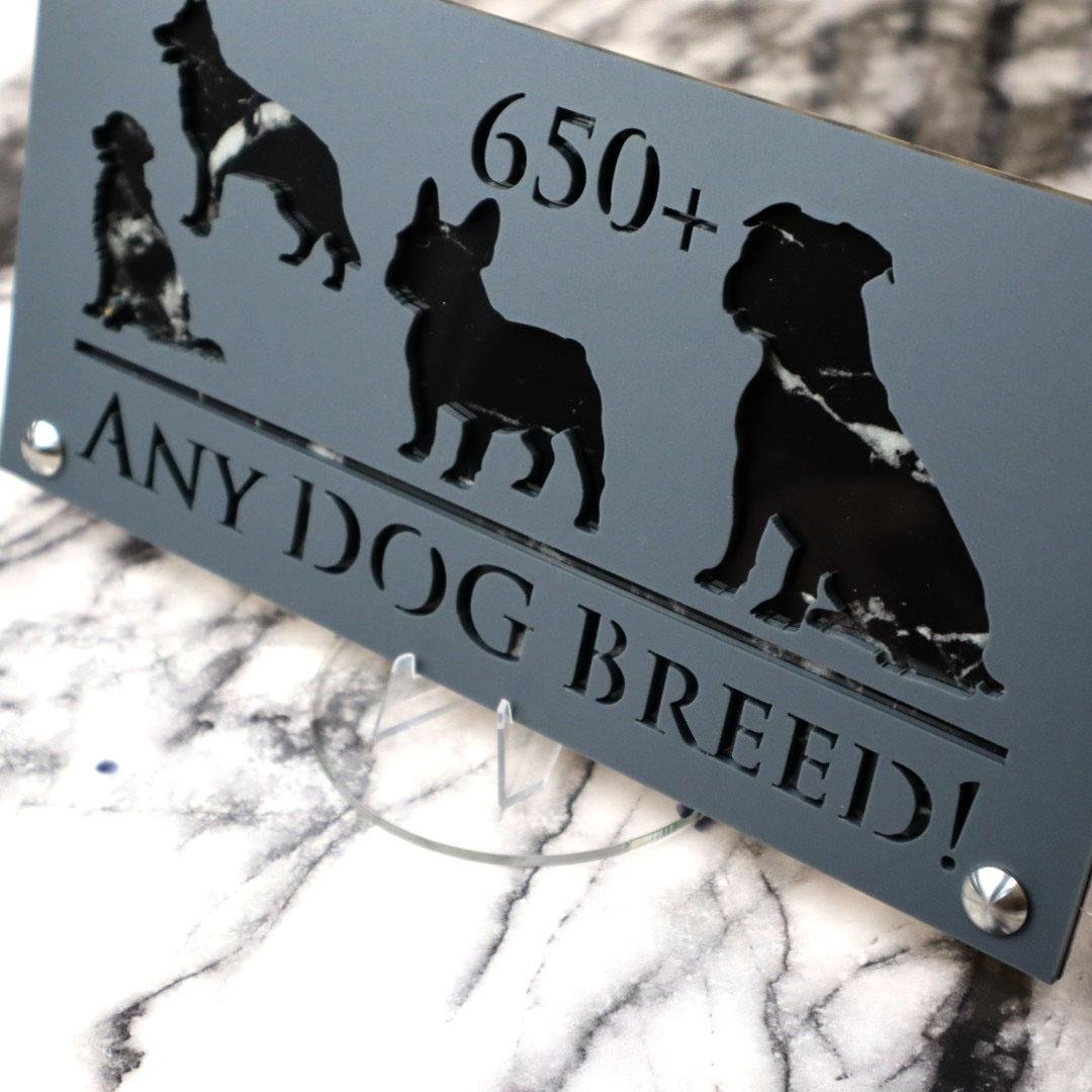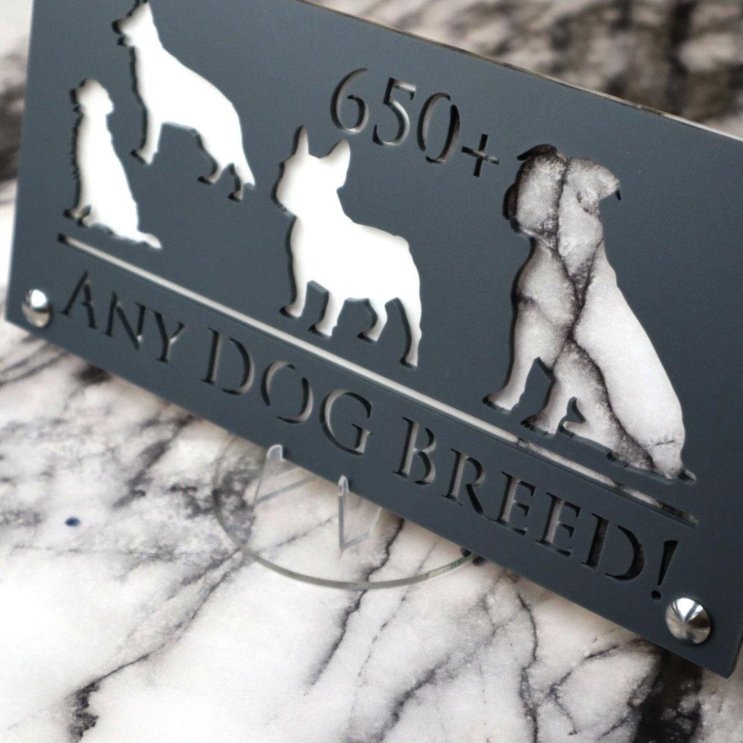 Introducing Dog Luxe A4: Elevate Your Home with Elegance YOU CAN HAVE ANY DOG BREED YOU WANT ON THIS SIGN – We have an extensive database with over 650 dog breeds. Just let us know your preferred breed, your house number, and your street name.