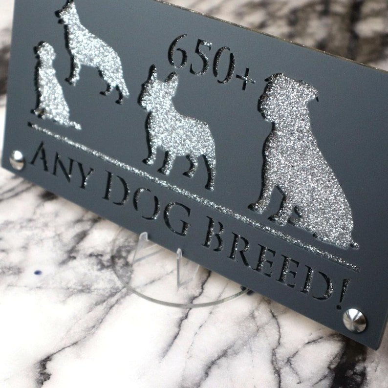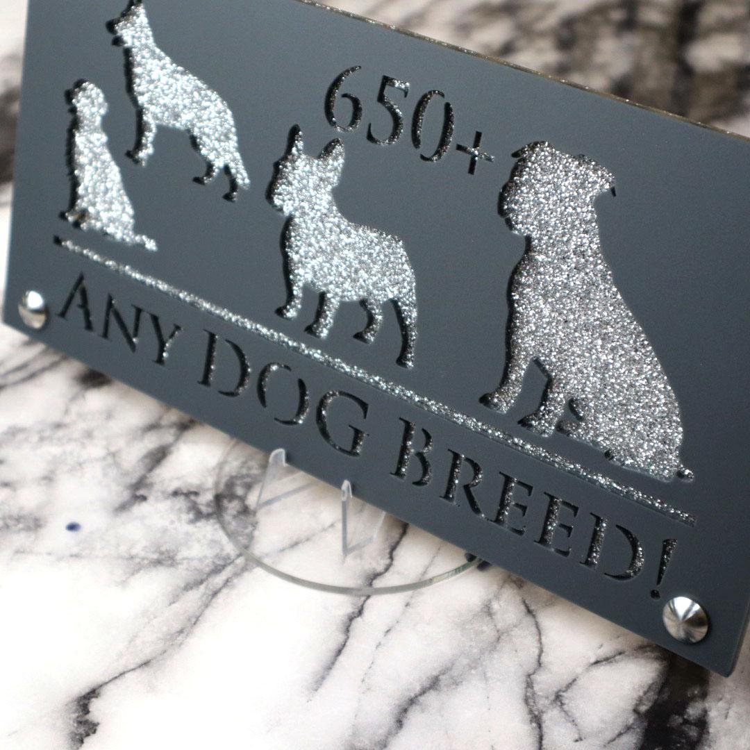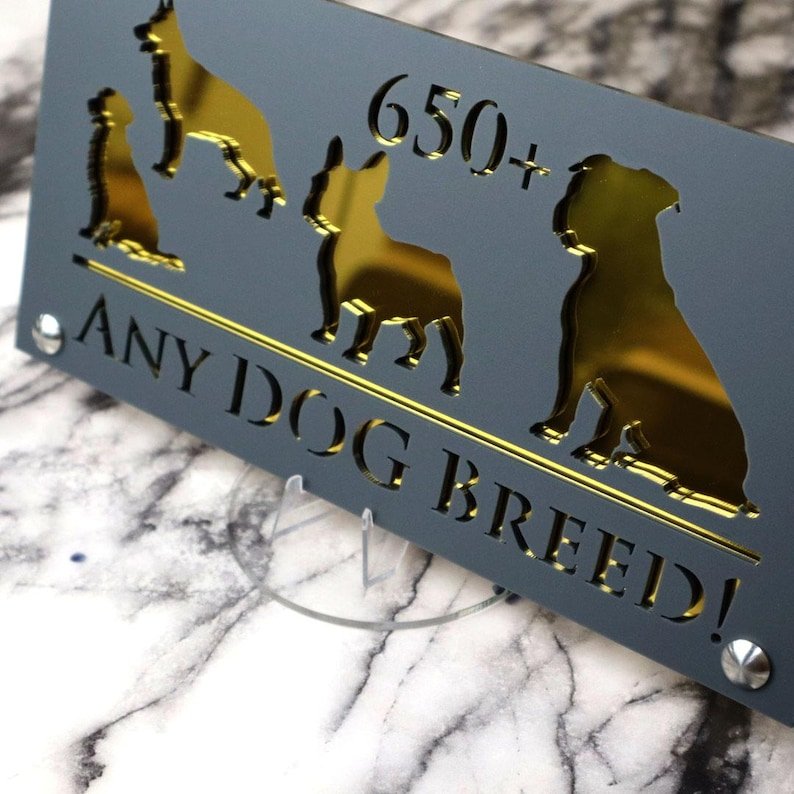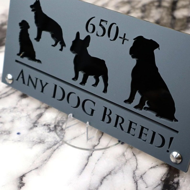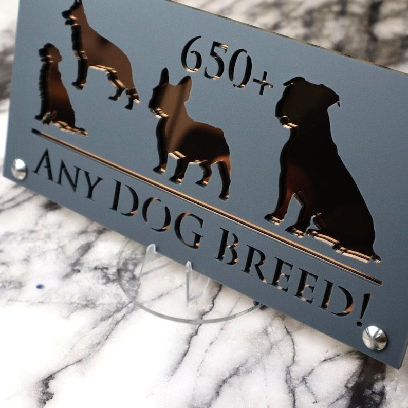 Introducing Dog Luxe A4: Elevate Your Home with Elegance YOU CAN HAVE ANY DOG BREED YOU WANT ON THIS SIGN – We have an extensive database with over 650 dog breeds. Just let us know your preferred breed, your house number, and your street name.