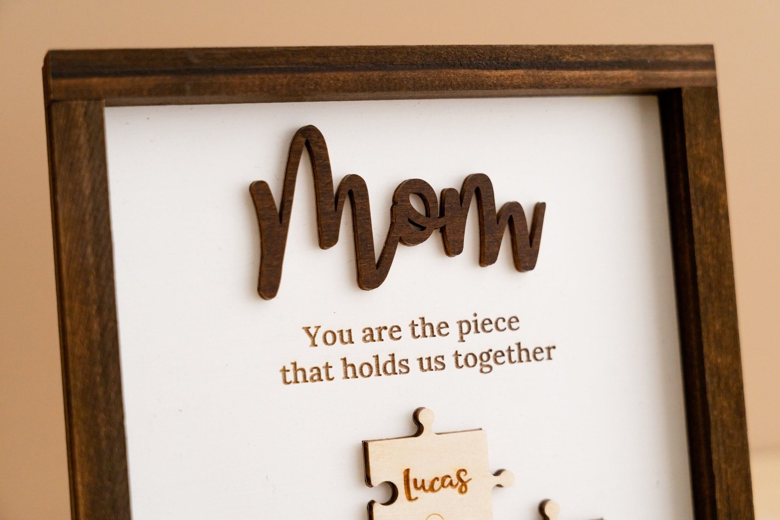 • 💬 Heartfelt Engraved Message The touching phrase “You are the piece that holds us together” is deeply engraved on the faux shiplap background, adding a meaningful layer of emotion to the overall design.